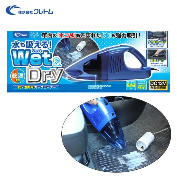 クレトム ウェット&ドライもも太郎 乾・湿両用カークリーナー 掃除機 水気もOK 収納袋付き 車内 DC12V ブルー DA-38