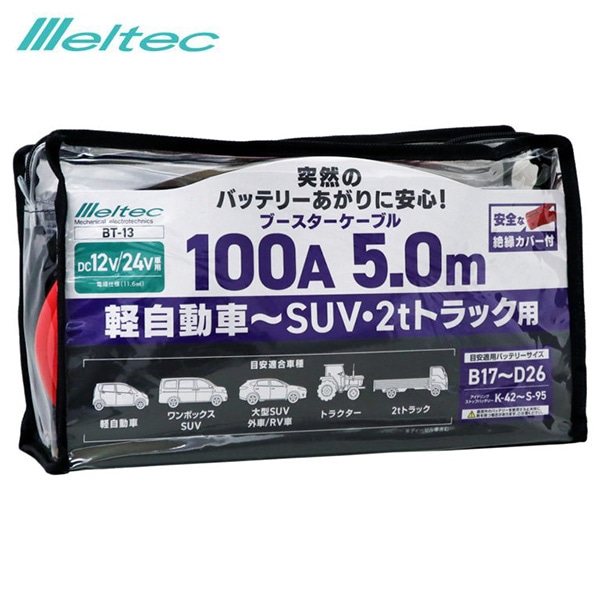 大自工業/メルテック ブースターケーブル 100A 5.0M DC12/24V 軽自動車~SUV・2tトラックまで 大型車OK バッテリーあがり BT-13