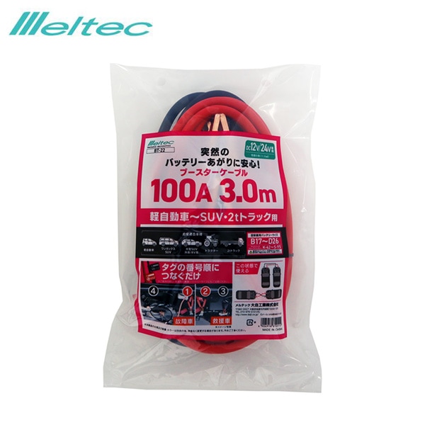 大自工業/メルテック ブースターケーブル 100A 3.0M DC12/24V 軽自動車~SUV・2tトラック 大型車OK バッテリーあがり BT-22