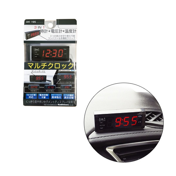 カシムラ マルチクロック 時計 車内 時刻/電圧/温度 両面テープ 電池交換不要 セグメントディスプレイ AK-195