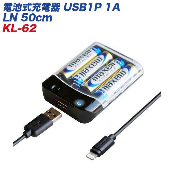 カシムラ 電池式充電器 USB1P 1A LN 50cm iPad/iPhone 通電確認LED付 単三乾電池 KL-62
