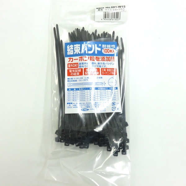 トヨミツ:結束バンド 黒 3.6×150mm 100本入 配線 ケーブル 野外OK 耐候性/601-W15