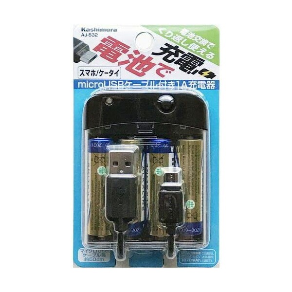 カシムラ 電池式充電器 USB1P 1A micro 50cm スマホ/ケータイ 通電確認LED付 単三乾電池 AJ-532