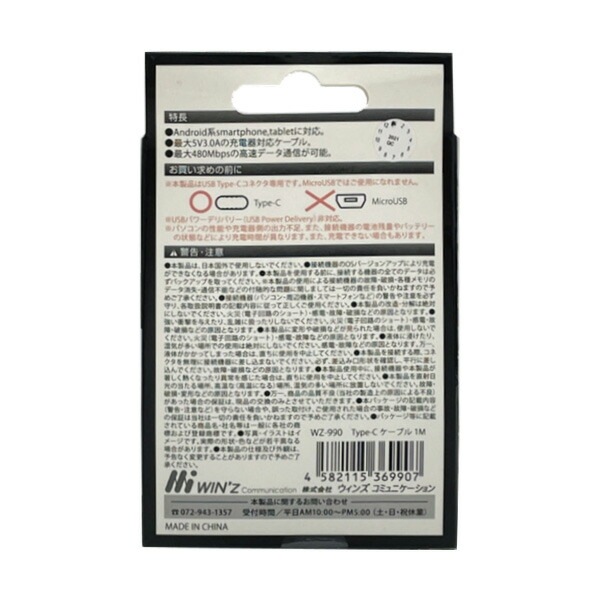 WINz Type-C USB2.0 ケーブル 1m 変換ケーブル スマホ 5V 3.0A 高速データー通信 最大480Mbps android 携帯 充電 WZ-990